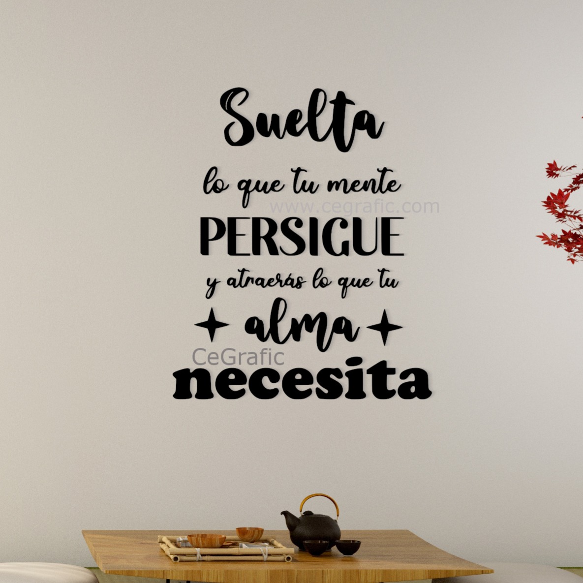 El espacio que ocupa puede variar dependiendo como ubiques las letras; la imagen es solo una referencia. La palabra PERSIGUE Y necesita te llegan letra por letra para pegar a tu gusto. No es un cuadro, son palabras sueltas.