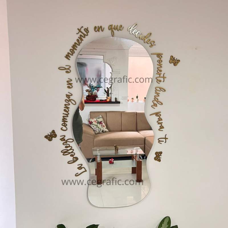 Elaborado en madera mdf de 4mm y vinilo adhesivo negro, dorado o plateado.